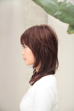 アゴ下から鎖骨にかかるミディアムレイヤーです。似合わせでレッドバイオレットのカラーがきめて◎この色味は可愛らしく女性らしいイメージがあり、グロッシーだけど軽やかなツヤの質感表現ができます。フェミニン系の方全般に似合いますよ。